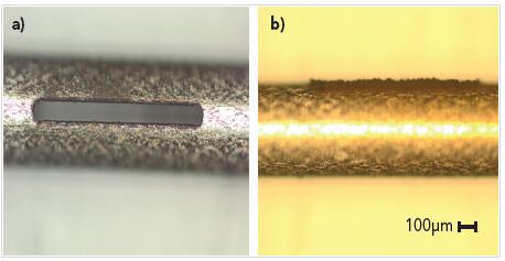 圖1:用飛秒激光器在不銹鋼樣品(a)上加工槽口。不需要進行后續(xù)加工,因為熱影響區(qū)域(HAZ)幾乎可以忽略不計。用納秒激光器加工的樣本(b)會出現(xiàn)較大的模糊區(qū)域,需要進行額外的加工。