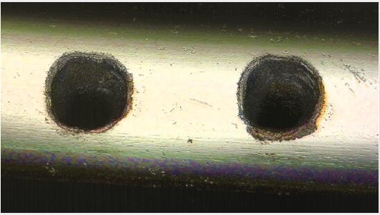 圖3:在100微米的鈷鉻(CoCr)線纜上的這些盲孔顯示,飛秒激光器可以消融表面,并且不會出現(xiàn)微裂紋