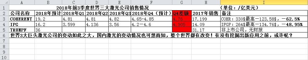 2018年前3季度世界三大激光公司銷售情況及國內(nèi)主流激光銷售情況,前2個季度均屬增長的行情狀態(tài),但是,從3季度開始,所有公司銷售均不達(dá)預(yù)期,而到了第4季度更進(jìn)入悲觀情緒,甚至美國相干公司給出了2019年的負(fù)10%—15%的預(yù)期。
