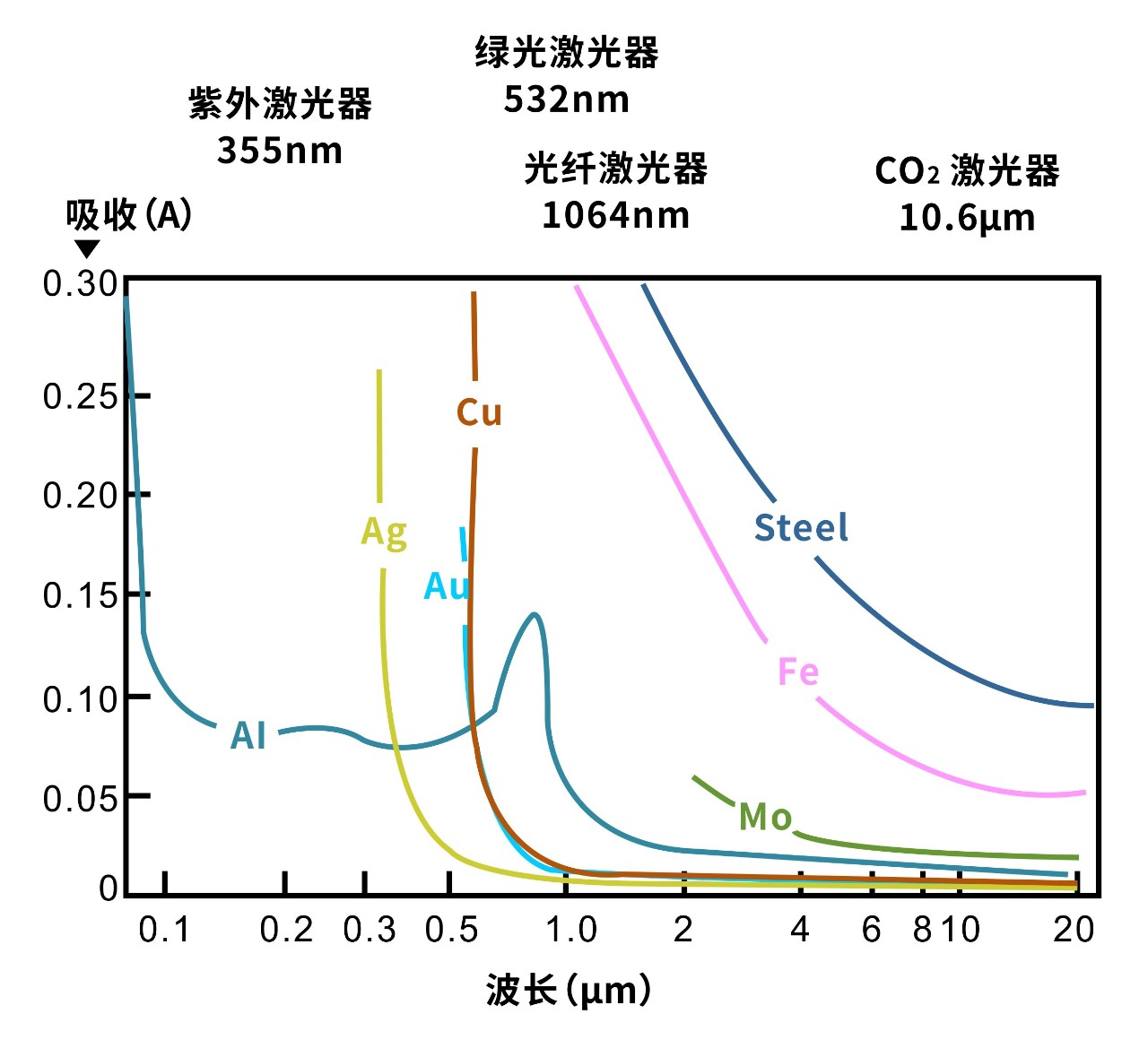 對于不同輸出波長的激光,不同材料表現出不同的吸收率(高反與否)。