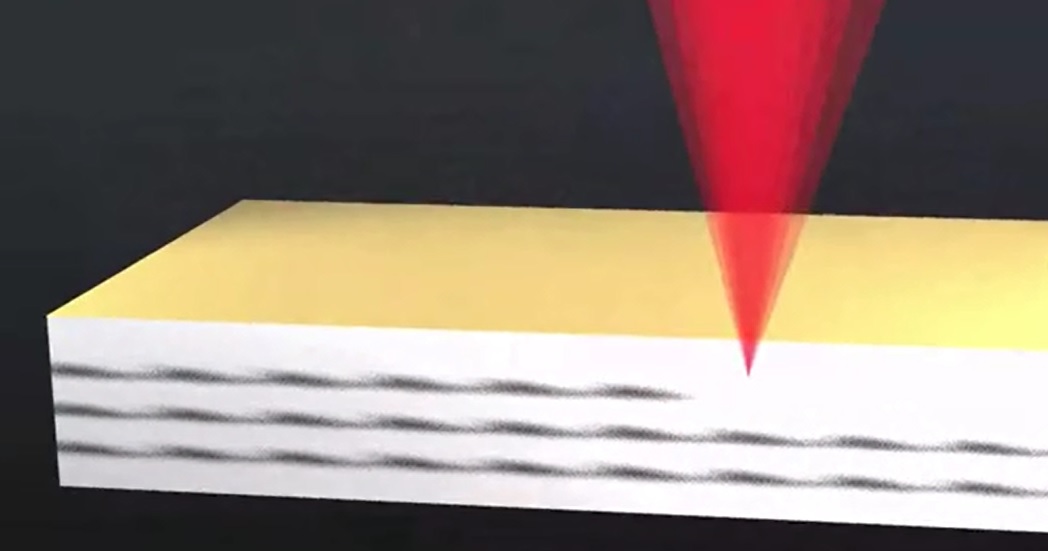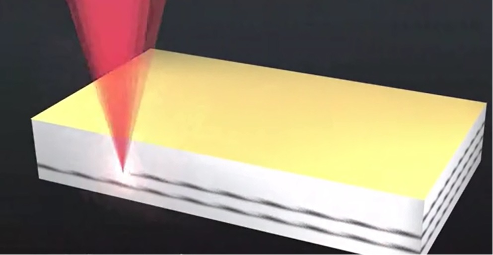 激光隱形切割是運(yùn)用多光子吸收的光學(xué)損傷現(xiàn)象來完成切割,當(dāng)激光掃描在透明材料中間位置時(shí),聚焦在材料內(nèi)部的激光強(qiáng)度迅速增強(qiáng)材料即被加工,從而在材料內(nèi)部形成一個(gè)改質(zhì)層(也有叫SD 層),使材料由結(jié)構(gòu)緊湊、結(jié)合緊密的不易于分?jǐn)嗟恼w改變成結(jié)合松散、易于分?jǐn)嗟拇嗾w(有的叫打破分子鍵),所以有的叫激光改質(zhì),再用裂片機(jī)將透明材料裂開即可。