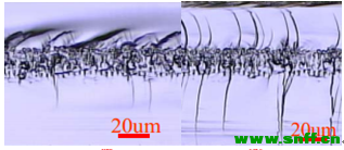 而激光隱形切割,則完美的解決了如上問題,全干式制程,無需清洗,切割道控制在幾個(gè)μm以內(nèi),崩邊也控制在幾個(gè)μm以內(nèi),速度是傳統(tǒng)刀輪切割的20倍以上,這就是技術(shù)的完美替代。美中不足的就是采用激光隱切工藝,無法滿足厚片制程,1mm以上的就不要考慮激光隱切了,另外,激光隱切工藝對(duì)材料表面的粗糙度也有一定的要求,粗糙度越高,越會(huì)對(duì)激光隱切產(chǎn)生漫反射,粗糙度越低,越對(duì)激光隱切越有利。下圖粗糙度Ra<0.07μm與Ra>0.07μm硅片切割后的Si片切割效果對(duì)比,請(qǐng)仔細(xì)看右面粗糙度大的效果,是不是特別差。